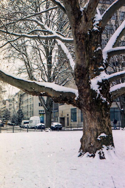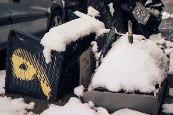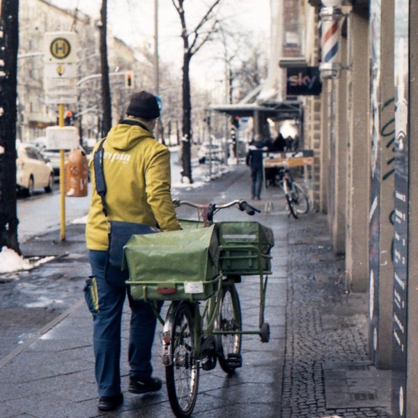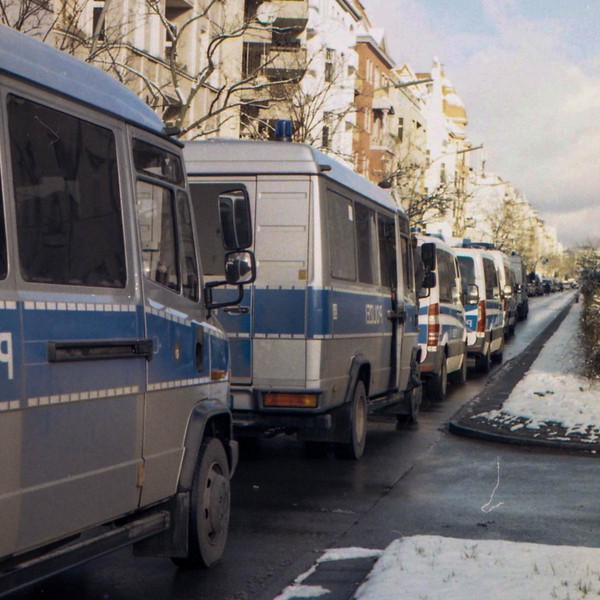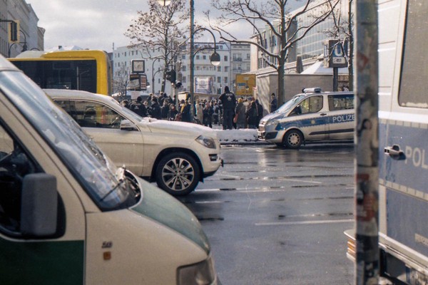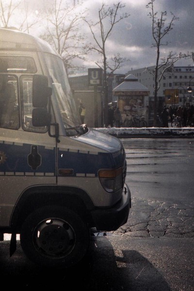 besuch in neukölln und kreuzberg, eine demo am hermannplatz. schnee in den straßen, die sonne scheint grell, januar in berlin.