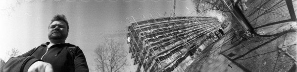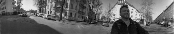was ein spaß, eine 360°-Kamera mit kleinbildfilm. so richtig klappt es nicht immer mit einer vollen drehung, aber ist auch egal. die perspektive ist super. spaziergang durch pankow, was sonst. und weil ich auf allen bildern drauf bin (fast unvermeidlich), bin ich jetzt influencer. es werden auch die führungslöcher belichtet (sprocket holes), aber die bekomme ich nicht mit gescannt in meinem scanner.