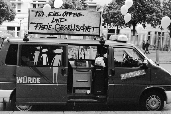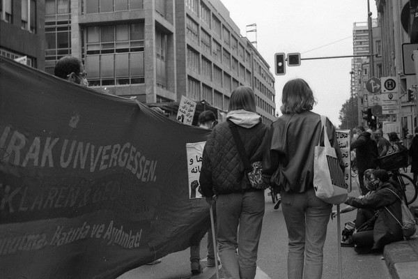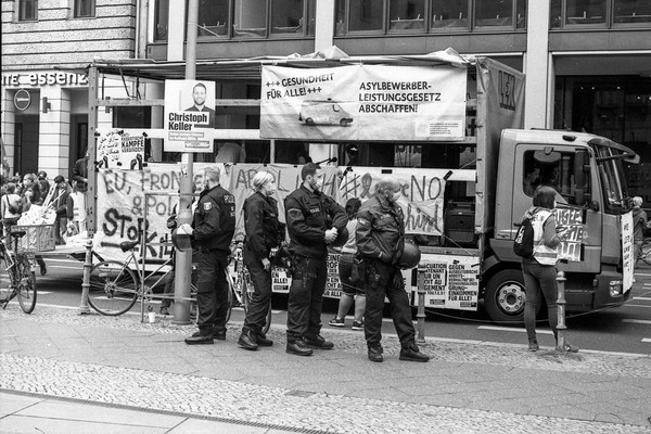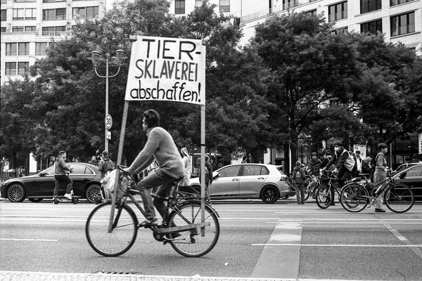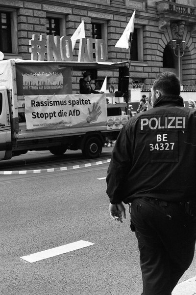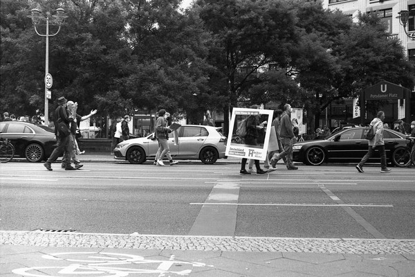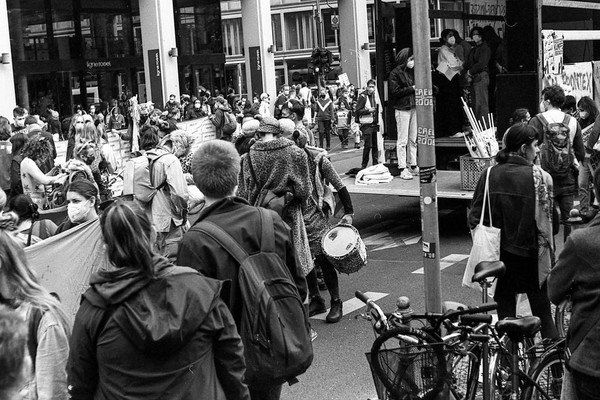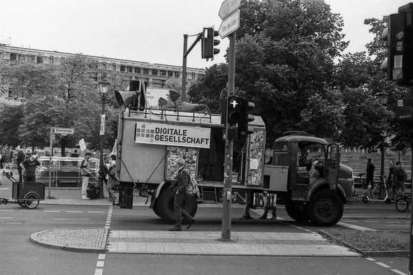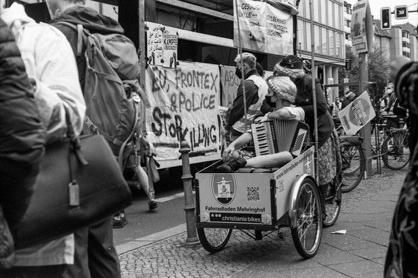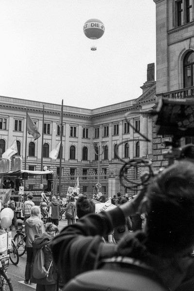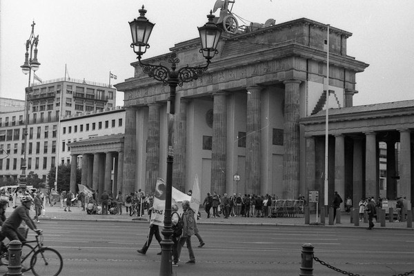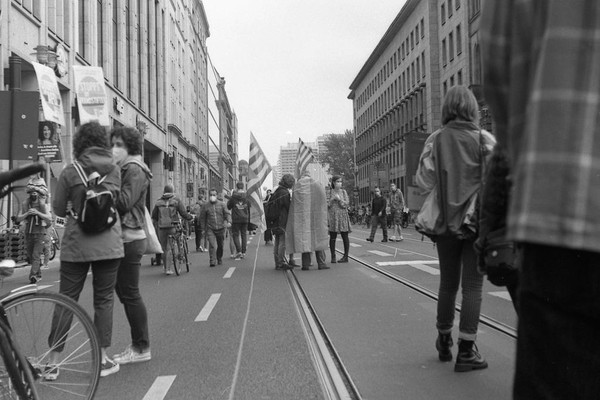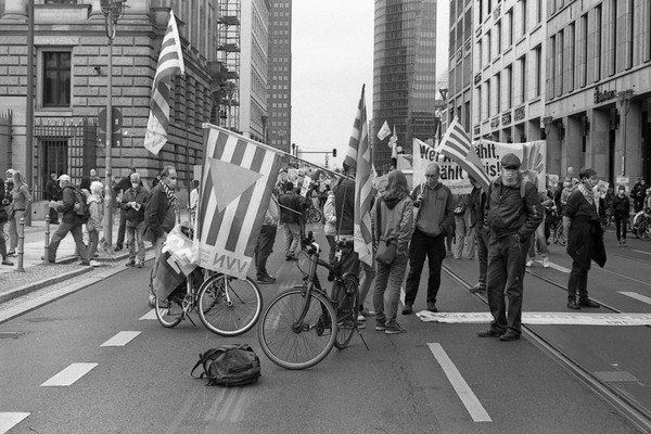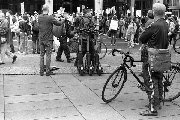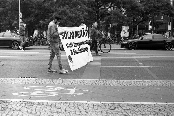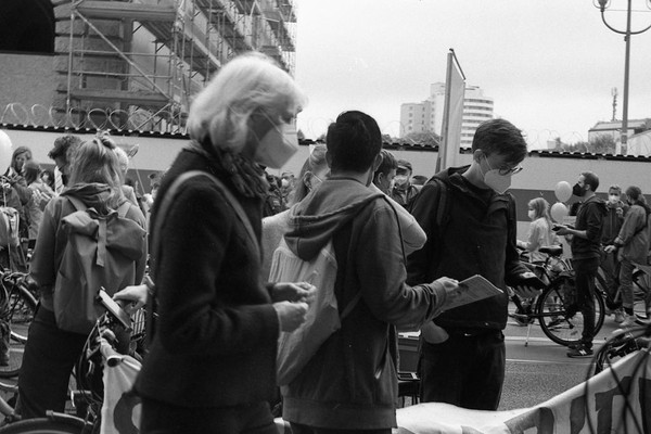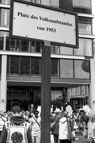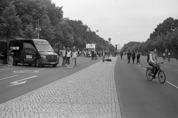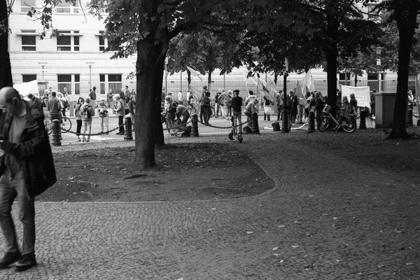 #unteilbar in berlin anfang september 2021 mit der zorki c. spaziergang nach niederschönhausen. die kamera bedient sich wie eine schraubleica, die belichtung ist geschätzt und sitzt überraschend gut. drei wochen vor der bundestagswahl ist die beteiligung an der demo überraschend gering.