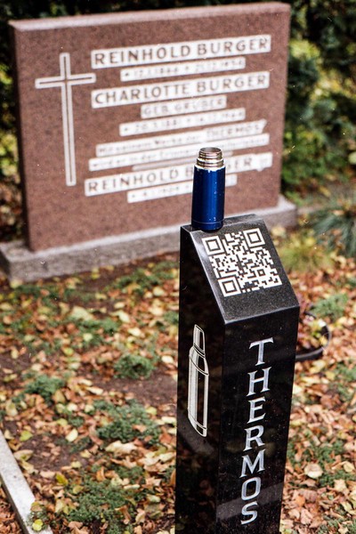 ritter in der schönholzer heide und eine thermoskanne auf dem grab von reinhold burger.