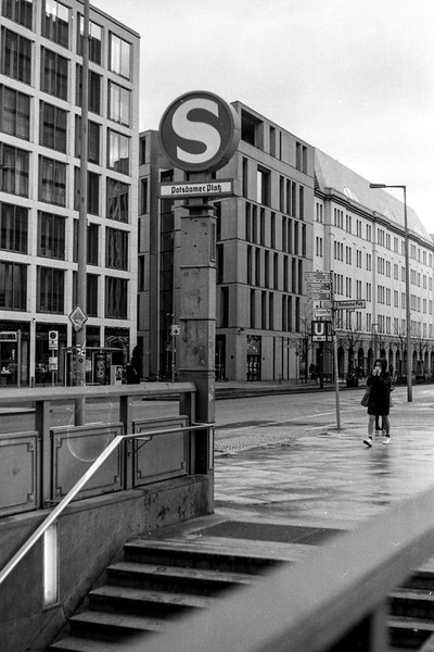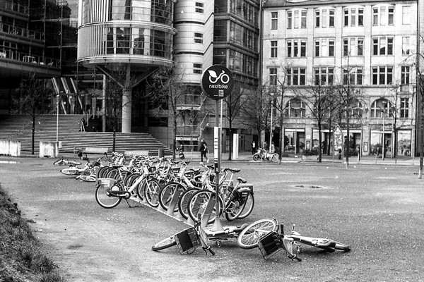 nach einem sturm im februar sind fahrräder und roller umgekippt am potsdamer platz. besuch in sachsen mit der bahn und erste frühblüher zeigen sich im garten. eine wanderung um den sbhf wollankstraße.