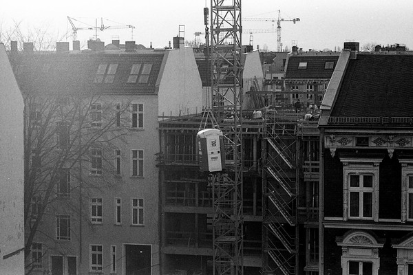 noch ein rest ostsee und pankreich. auf der baustelle gegenüber wird ein klo mit dem kran transportiert. sonnenstrahl in der schönholzer heide.