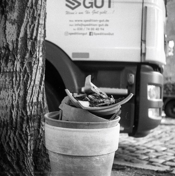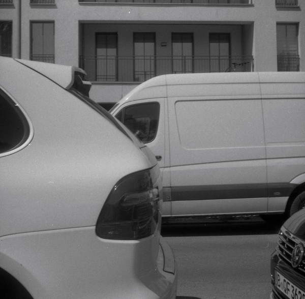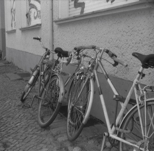mit der taxona habe ich nur einen, ebendiesen film belichtet. den andere film habe ich zerstört, als ich die kamera geöffnet habe, ohne ihn korrekt zurück gespult zu haben. das liegt an einem grundlegenden problem, der transportmechanismus passt nicht zu aktuellen filmkasetten, eine gute beschreibung und lösungsansätze finden sich hier. spannend: die taxona macht quadratische bilder auf einem normalen kleinbildfilm, also hat man 50 statt 36 aufnahmen. mehr als ein kleines guckloch gibts nicht, der fokus wird geschätzt. hat aber ganz gut funktioniert.