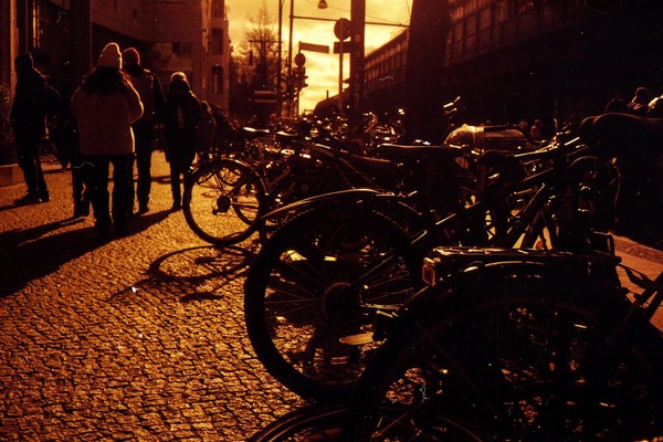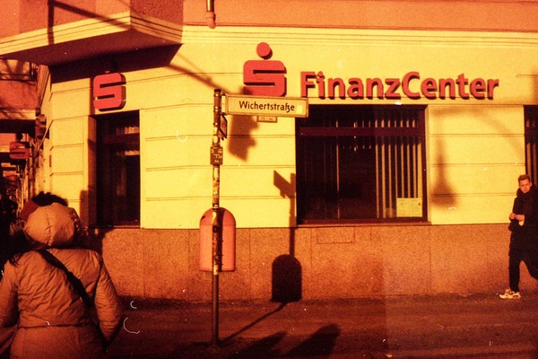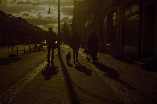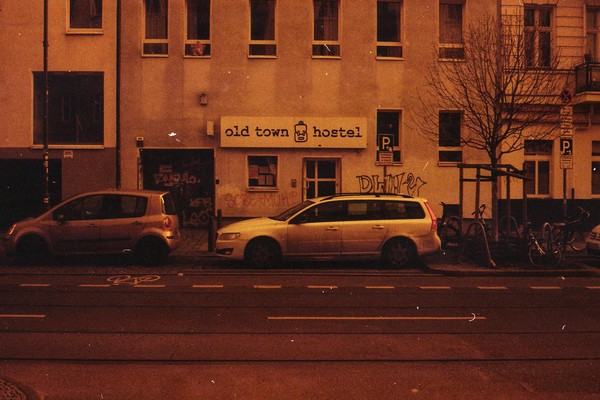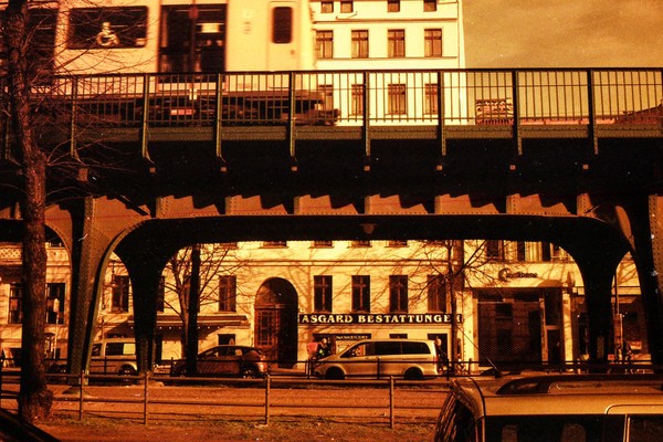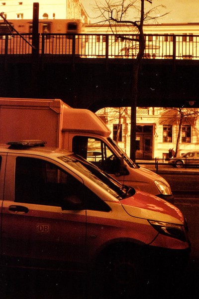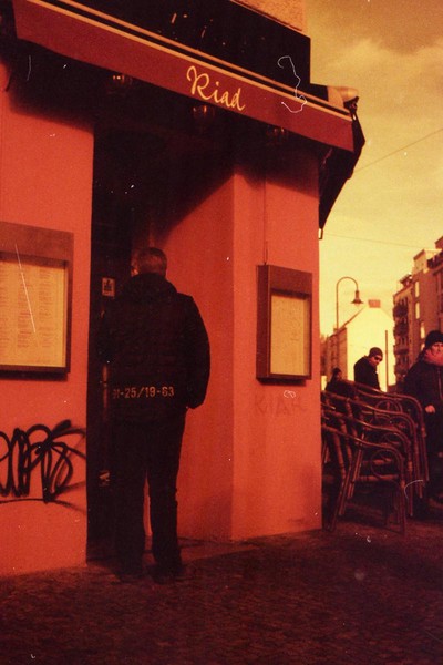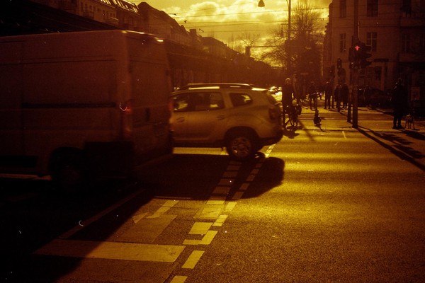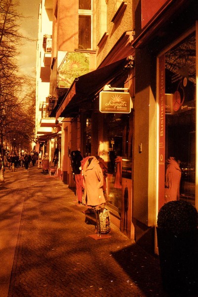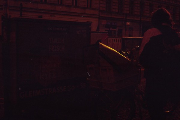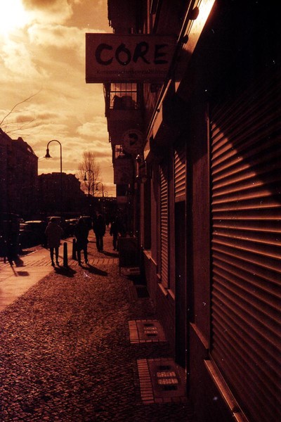 was aussieht wie apokalypse, ist ein normaler farbfilm, der von der anderen seite belichtet wurde (redscale). solcherlei filme gibts im handel, hier habe ich den film im wechselsack umgespult. spaziergang durch prenzlauer berg im februar.