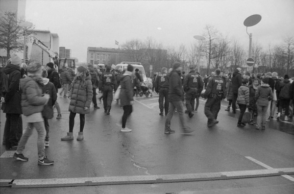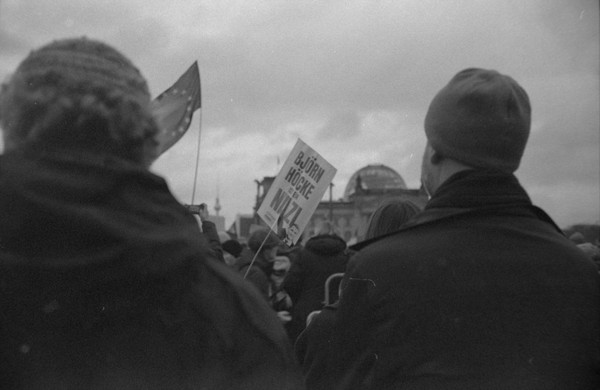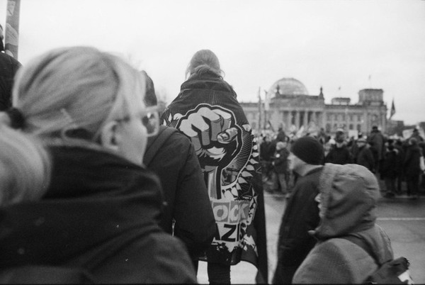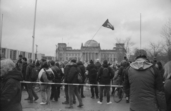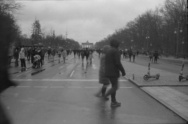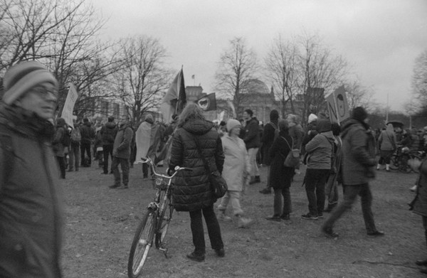 000251 - 02/24 Apr 21, 2024 📷 Leica M5 🎞️ Ilford Delta 400 🥫 Kodak HC-110 1+31 6,5min 💻 Sony Alpha 6000 eine demo gegen rechts im februar, das wetter ist mies, aber die wiese vor dem reichstag gut besucht. 📂 35mm berlin 🏷️ berlin berlin-mitte demonstration