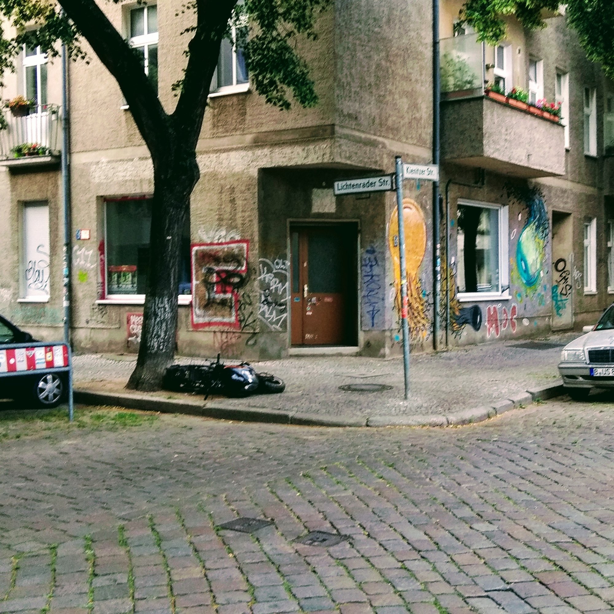 Wir fahren von Kreuzberg nach Neukölln mit dem Fahrrad. Durch die Hasenheide, vorbei am Sommerbad Neukölln und dem Tempelhofer Feld. Es ist der 21. Juni, es ist sehr lange hell, viele sind unterwegs. Das Kopfsteinpflaster nervt mit dem Fahrrad. An der Ecke liegt ein umgefallenes Mofa, hier war sicher mal eine Eckkneipe, auf den Wänden großflächige Graffitis.
