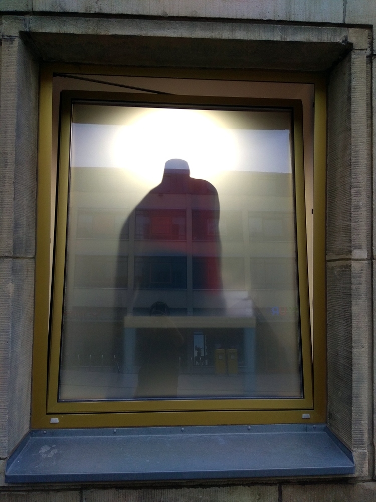 wir stehen am dresdner altmarkt an historischer bausubstanz. ist es ein mensch oder eine puppe? ein superheld vielleicht oder nur sein kostüm. die milchige scheibe verbirgt die wahrheit. der fensterrahmen ist golden, so dass es ein bisschen wie ein gemälde wirkt. irgendwas düsteres romantisches, vielleicht von caspar david friedrich, oder ist es dafür zu wenig gegenständlich?