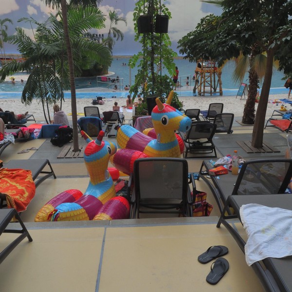 jedem anfang wohnt bekanntlich ein zauber inne (( Hermann Hesse: Stufen, 1941)), in brandenburg hingegen entstehen aus gescheiterten großprojekten noch größere merkwürdigkeiten. seit 16 jahren ist die einstige luftschiffhalle nun schon ein tropischer freizeitpark. inzwischen betrieben von einem spanischen unternehmen und gut besucht. corona gibts hier nicht mehr, keiner trägt maske, nur badesachen. es ist alles ein bisschen viel und durcheinander, zu teuer und teilweise absurd. muss man mal gesehen haben, dann reichts aber auch.