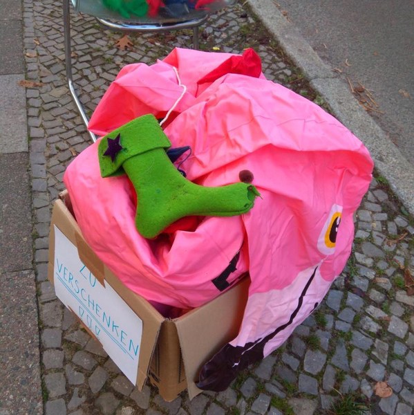 beim herumstromern durch pankreich fallen immer wieder die zu-verschenken-kisten auf. sie sind prall gefüllt mit dem wohlstandsmüll der nachbarn. überflüssige dinge müssen raus für neuen scheiß. wobei sich die kisten von viertel zu viertel unterscheiden und wir langsam mal einen wirtschaftsindex bauen sollten, der auf weggeworfenem basiert. ein paar straßen weiter im wedding wird anders weggeworfen und ich mag mir nicht ausmalen, was in zehlendorfer kisten landet. hier also eine nicht repräsentative auswahl: