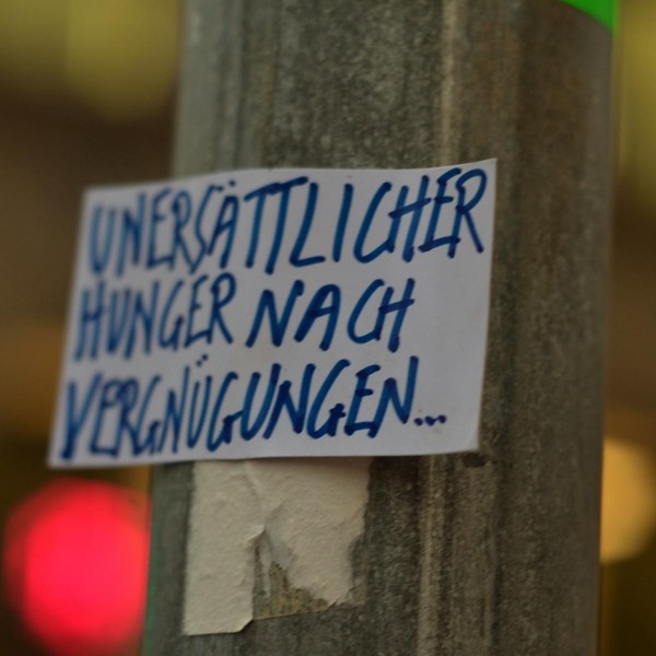 an einer laterne an der ecke friedrichstraße ein selbstgeschriebener zettel “UNERSÄTTLICHER HUNGER NACH VERGNÜGUNGEN…”, genau dort, wo es kein vergnügung mehr gibt. wo stadtleben genau nicht stattfindet, sondern durch büro und verwaltung und straße und trourismus verdrängt wurde. die friedrichstraße überhaupt, einst zentrum der avantgarde und ausgehzentrum ist nun ein lächerliches sträßchen voll borniertheit und provinz. die trottoirs zurück gedrängt vom automobilen individualismus. und fahrräder überall, sie stapeln sich und bilden skulpturen an den kreuzungen. sie werden auch bewegt, man glaubt es kaum, sodass sich die skulpturen wie organismen jeden tag neu formieren. eine band bläst den lustigen marsch auf der friedrichsbrücke, der sound berlins ist schwer zu beschreiben, hier klingt er nach jazz und großer welt.