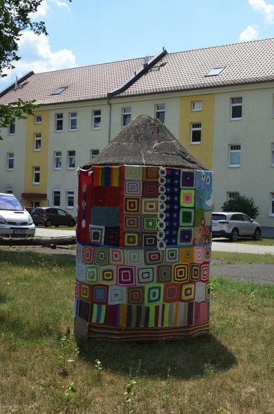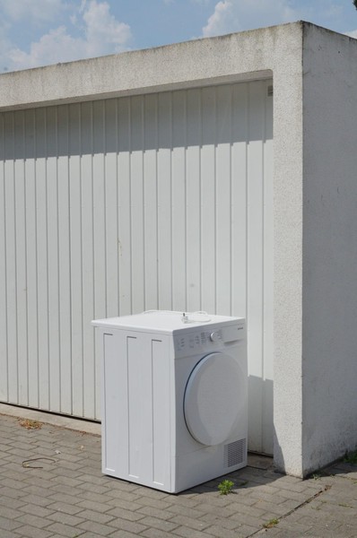 bonus: an einer garage eine waschmaschine, weiß in weiß, der obligitorische plastikstuhl, ein ein-mann-bunker ist umhäkelt